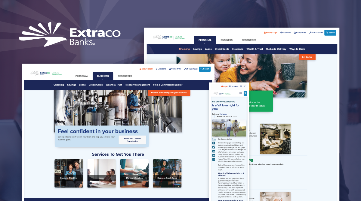 Extraco Banks website exemplifies consistent branding across their website and programs as color scheme, messaging, and fonts are carefully curated throughout the website.